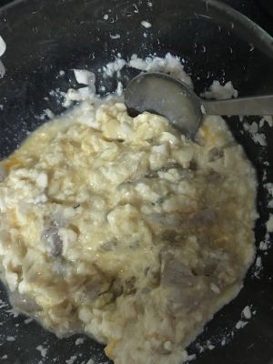 虾去泥肠切丁,马蹄切丁,压碎豆腐后,(我用了半盒豆腐,一盒就太湿了)加入料酒,盐,白胡椒粉和葱末以及一个鸡蛋