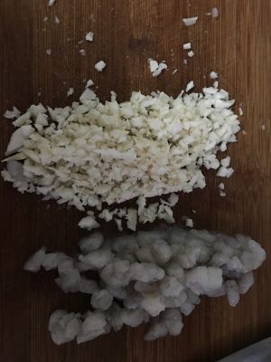 我用的是河虾,海虾都可以,先把虾皮虾线去掉,倒点料酒腌一下,然后把虾剁碎
