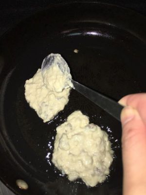 房里放油,油热了,把面糊用勺子盛入锅里,像这样一个一个小饼