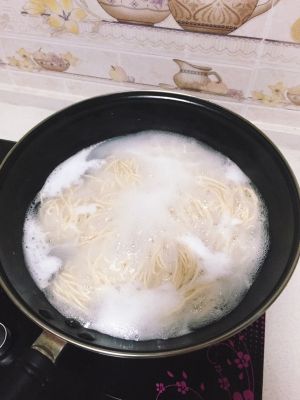抄豆芽的水不用倒掉,节约时间,我们可以等再开锅后,直接下面条,我喜欢吃稍微筋斗一些的面条,面条煮熟后,捞出放入冷水中,过凉。