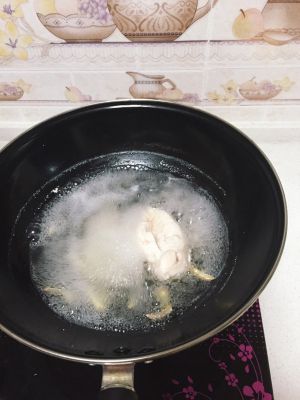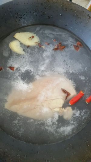 烧水煮鸡脯肉 放姜片若干 倒入料酒 煮十分钟