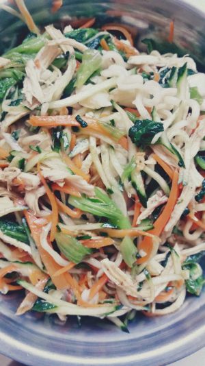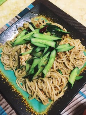 将面沥干水分,放入盘中放上鸡胸丝,调料黄瓜丝~搅匀即可食用~