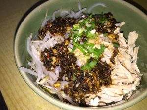 最后,准备一个空碗,放入面条,附上豆芽和鸡丝,浇上准备好的酸爽料汁,撒上葱花,一碗可口的鸡丝凉面就做好了,一口接一口,包你吃的停不下嘴。