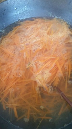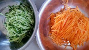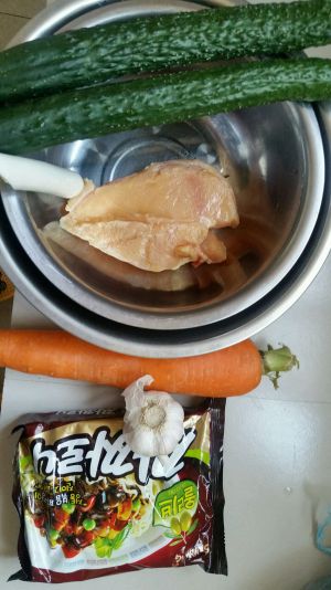 鸡脯肉提前煮熟,放凉后撕成丝,黄瓜胡萝卜切丝