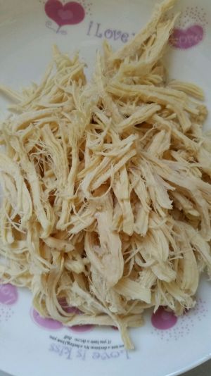 把鸡胸肉煮熟,加点盐巴,料酒,八角等