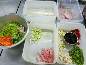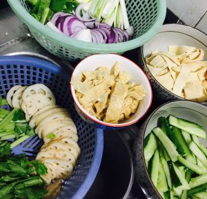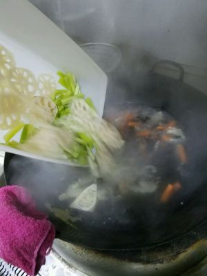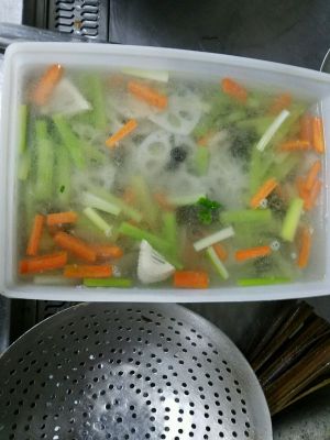 配菜分两次焯水,先下胡萝卜木耳冬笋等耐煮不易变色的