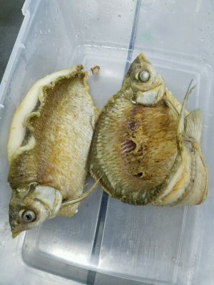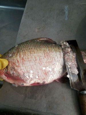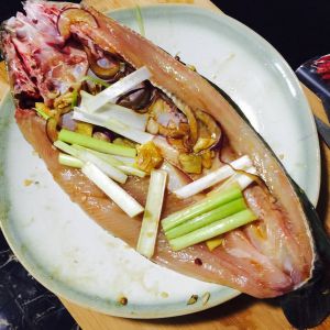 去鳞去腮内脏,一批两半,实在怕切手,妹子们可以改个花刀吃正鱼也是可以的,然后抹盐,倒黄酒入味
