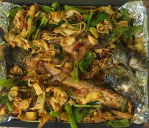 然后翻滚吧!装盘,一半垫底,一半盖鱼上,为防止烧干,可以高汤再配一点麻辣豆豉淋上去