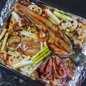 我用的是摩飞锅,锅中刷上油,把配菜铺在上面,(我用的藕片、青笋和芹菜,大家根据自己的喜好放配菜),把烤好的鱼放在配菜上面,倒入调料在锅里,调料汁不到鱼的一半,不用太多,在鱼上放上香菜,淋上热油,小火慢炖,鱼肉外焦里嫩,非常入味。