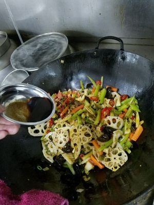 切好菜准备做酱汁!半碗郫县豆瓣酱,一头蒜,姜切丁,孜然,花椒,辣椒,一起放油锅拌炒,炒香后加水,把菜加入炒5分熟!