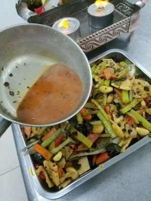 放入生的藕片垫底,加腌制好的鱼,倒入刚刚炒好的酱汁水,(这是不要把刚才的菜放进去)烤箱200度上下火烤30分钟!然后放上刚才的菜继续烤15分钟即可!这样菜更入味