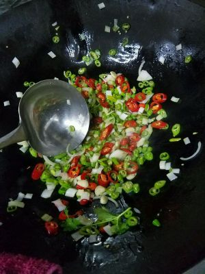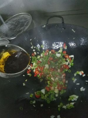 锅上油,下葱姜蒜沫和青红椒圈爆香