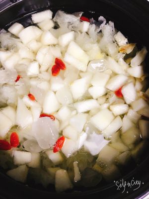 大概炖了四个小时左右,期间加了一次水。。。。感觉像胶状就可以盛到准备好的雪梨盅啦!!!完美——我的夏末秋初
