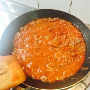 锅内放油,放入番茄碎炒致番茄完全变软接近于糊状时再加入番茄酱,最后把肉馅倒进去一起翻炒加入适量盐,迷迭香,糖还有一小块儿黄油调味即可。
