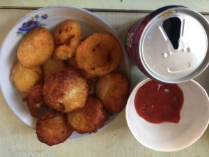 然后把案板铺上保鲜膜,上面撒一点淀粉在把土豆饼在案板上铺开,用手把土豆饼压成薄片,注意如果土豆饼还是软软的就把土豆饼弄厚一点,然后用手或磨具揉成圆形,心形都可以,这时把油烧热就可以炸了,出锅配上番茄酱!味道好极了!