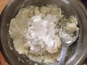 将2放入土豆泥中,加少许面粉或淀粉拌匀,加入盐和酱油调味;