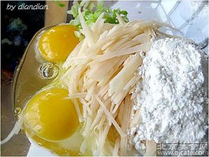 土豆切丝,鸡蛋打碎,面粉和淀粉适量放入一个碗中,加入盐,鸡精,南德,搅拌均匀
