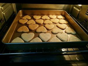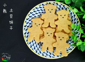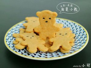 小熊的,用饼干模压好后,拿一支牙签沾一下水,再沾黑芝麻做小熊的眼睛和嘴
