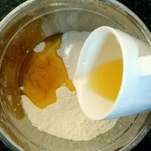 将低粉,玉米淀粉,小苏打,盐混合过筛。倒入植物油,这里我用了花生油