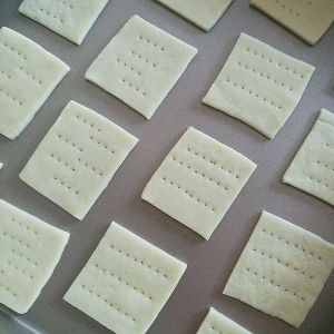 檊好后用刀切成方片,这里我是随手切的没有量,大家可以随意切或做成自己喜欢的型状,切好后用叉子叉一些小孔
