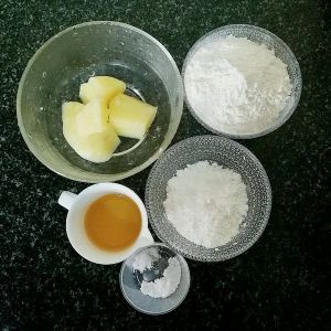 准备好鸡蛋两个,土豆一个,淀粉、面粉适量,盐,鸡精,南德