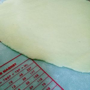 将混合好的面团用檊面杖檊成薄片,越薄越好,因为越薄会越脆,大约檊成0.3cm