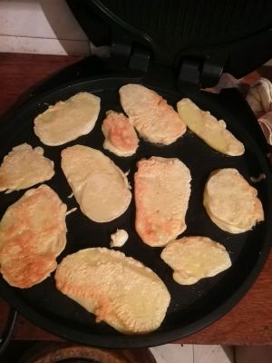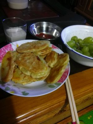 面粉,盐,黑胡椒粉,鸡蛋,适量水,搅和成略粘稠的面糊,把土豆切片,土豆片整个挂上面糊,电饼档放油,两面煎,没有电饼档的用锅子也行,注意火候