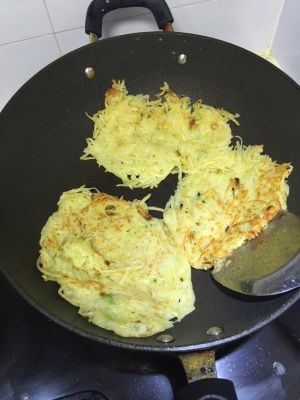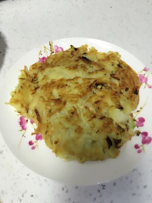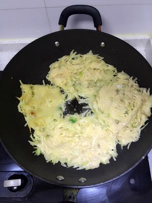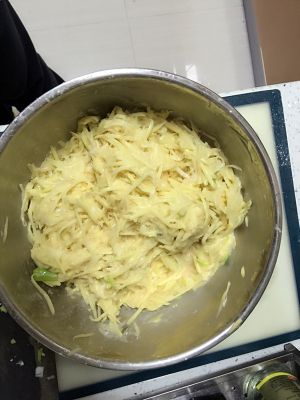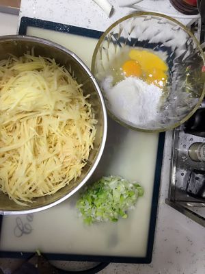 土豆切丝、葱花切碎,鸡蛋和面粉混合,面粉刚好能把土豆粘合最好,多了土豆饼会不脆(我就放多了),少放土豆会有丝丝站立的感觉