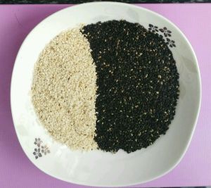 将芝麻放在干净无水容器中,黑芝麻买的熟的,白芝麻自己小火炒的。