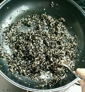 糖全部熬成汁,放入芝麻快速搅拌。糖汁全都包褒在芝麻上。