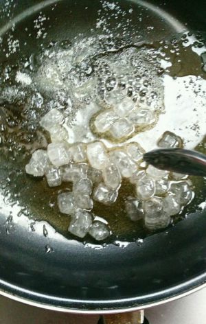 平底锅烧热,转小火放冰糖、蜂蜜,我怕不甜又加了1勺白糖。