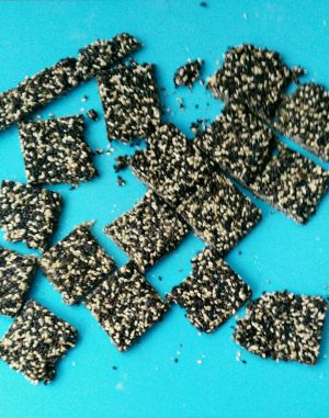 将芝麻移至事先准备好的干净面板上,趁热用擀面杖擀平,切块。