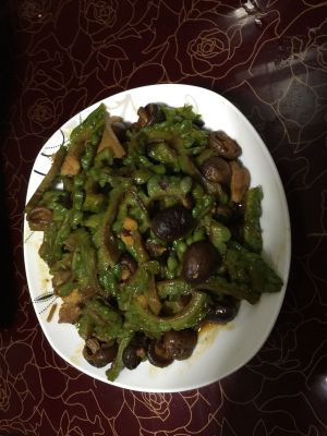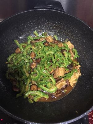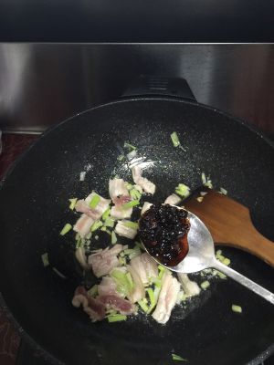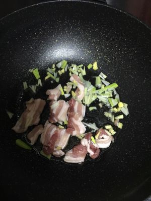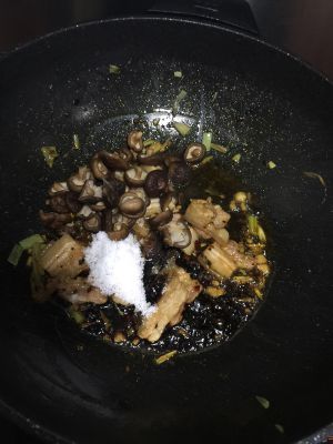 烧水的时候,另起一锅, 倒入油,把肉片和香菇加盐、生抽、黄酒翻炒一下,加水烧开。