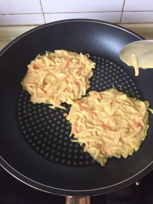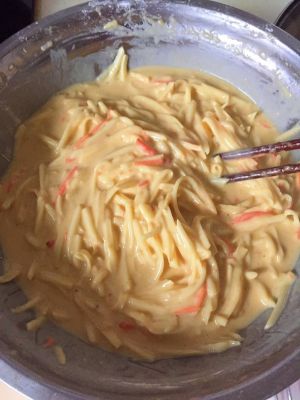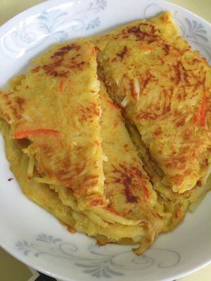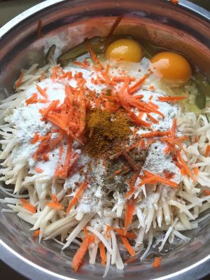 土豆擦丝.土豆先洗净啊.还用削皮吗?如果你重口味可以不削。胡萝卜擦丝.鸡蛋盐面咖喱粉胡椒粉都放一起.可以分开放吗?你神经病啊!