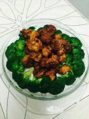 1.将鲜虾去皮,去除虾线后,虾背改刀切开缝隙,再将虾放入冰水中,冰水可以使虾在炸制过程中酥脆。水里放入少量糖和盐。 2.待西兰花做好后。可以把这边泡的虾捞出,挤干水分。用淀粉拌好。 3.油温180度左右将虾球放入锅中炸熟。一共炸制两遍。这样使得虾酥脆。 4.另起油锅,放入葱姜蒜末五香粉,小火放入虾仁,两勺糖,海鲜耗油,一品鲜酱油,陈醋少许,剁椒酱少许。翻炒即可出锅。