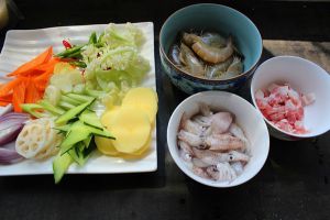 准备所有食材。切片,蔬菜根据自己喜好添加。虾和墨斗鱼处理干净。