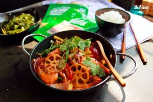 炒锅,下五花肉,炒香,放入大虾,炒熟。放入葱姜蒜片,爆出香味,根据口味放入适量麻辣香锅调料。
