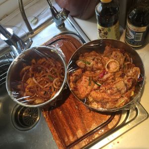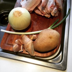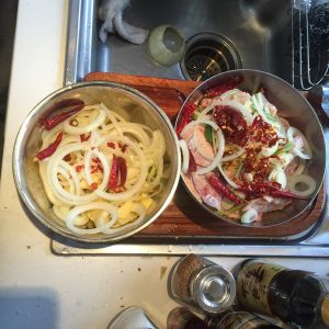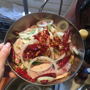 盆里放鸡翅 葱姜蒜 小部分洋葱圈 二荆条切碎 小米椒掰碎