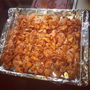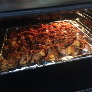 烤盘上铺上锡纸 先摆上鸡翅 再加上土豆洋葱