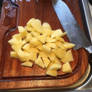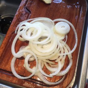 另一个盆里放入土豆 加入同样的料 大部分洋葱圈放这里 洋葱圈和土豆烤出来也很好吃哦