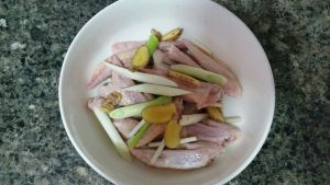 翅尖洗净后在两面划几刀口子,方便入味。加入葱段、姜片、料酒、生抽、盐、五香粉,腌制半小时。