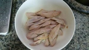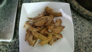 腌制好的翅尖,将里面的葱段、姜片捡出来,拍些淀粉裹在上面。