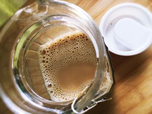 3、将甜味红茶过滤到装有速溶咖啡的杯里,然后加奶调匀即可。