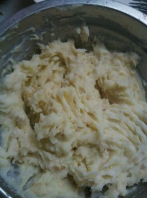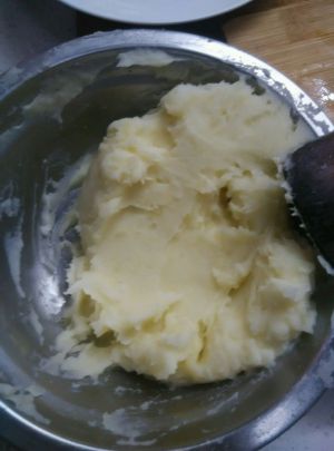蒸熟后,趁热加入黄油,打成泥,分次少量加入牛奶,搅拌均匀