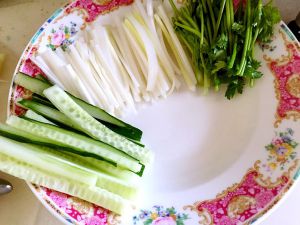 黄瓜切条,生菜叶盐水浸泡洗净沥干。