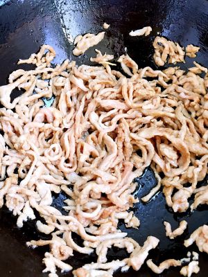 起锅烧油,放入肉丝翻炒。炒熟后盛出控油。
