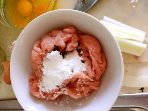 肉丝放淀粉、蛋清、少许酱油抓匀。放在冰箱里5分钟。