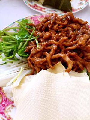 把腌好的肉放锅里炒熟后把甜面酱到进去,收汁。在盘里放上切好的葱丝和豆腐皮。大功告成了,和饭店的一样好吃