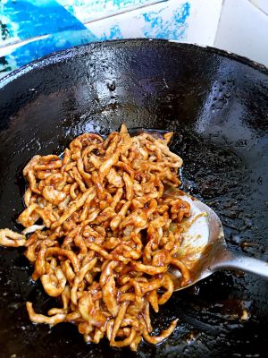 锅内放入甜面酱,糖,炒匀。把肉丝下锅炒至肉丝均匀挂色。