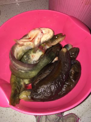这些就是主配料了。重点推荐一下小碗中装的黄酱,它是今年新腌制出来的东北大酱,做此菜必不可少啊。香菇本不是正宗鲶鱼炖茄子的配料,但我想创新一下,看看加上香菇能不能撑死俩老爷子。